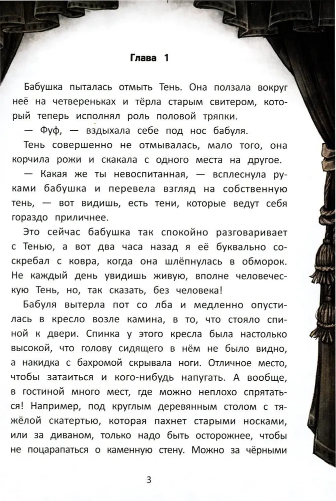 Вы видели когда-нибудь человека без тени? А тень без человека? Ещё вчера Натаниель, как и вы, ответил бы нет. Определённо нет! А сегодня... Сегодня по дому мадам Свинстлоу прогуливается Тень. Одна, без хозяина. Натан и его бабушка обнаружили её утром в гостиной. Кстати говоря, бабушка Натана - домоправительница у мадам Свинстлоу. И по её рассказам, это не первая странность в этом доме - доме с чёрными шторами! Натан с бабушкой решают разобраться в этом таинственном деле, чтобы помочь Тени найти её владельца.