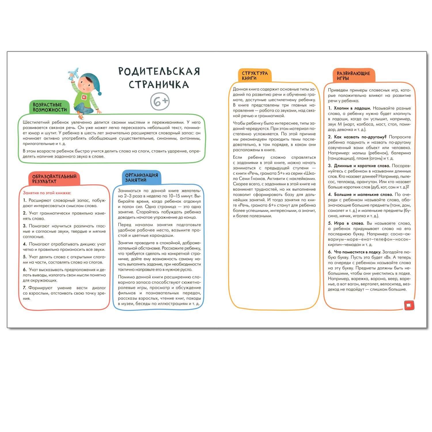 Книга «Речь, грамота 6+» из серии «Школа Семи Гномов. Активити с наклейками» предназначена для развития и тренировки грамотной речи у детей от 6 до 7 лет.
