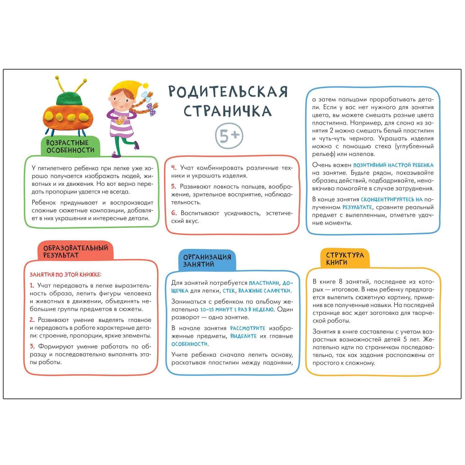 Книга «Лепка 5+» из серии «Школа Семи Гномов. Мастерская» — это красочный альбом для занятий лепкой с ребенком от 5 до 6 лет. Занятия на близкие и понятные ребенку темы расположены по мере усложнения: поступательно переходя от освоения простых навыков к более сложным заданиям, ребенок научится создавать творческую работу на бумаге с помощью пластилина.