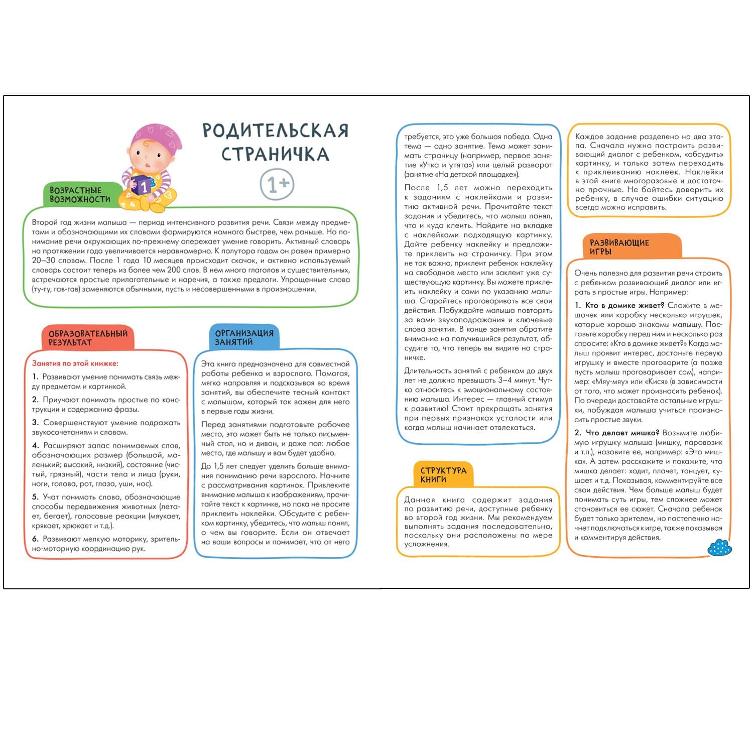 Книга «Развитие речи 1+» из серии «Школа Семи Гномов. Активити с наклейками» предназначена для развития речи и формирования словарного запаса у детей от 1 года до 2 лет.