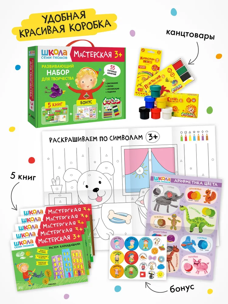 Развивающий набор для творчества 3+ (Школа Семи Гномов. Мастерская), 5 книг + канцтовары + бонус