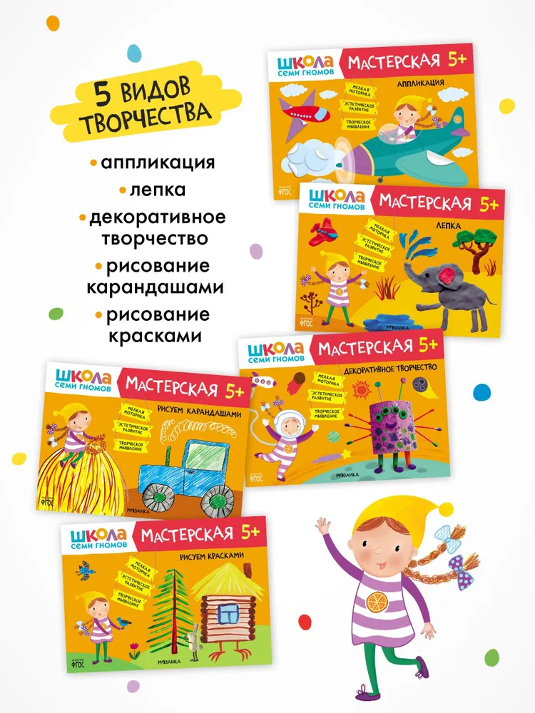 Развивающий набор для творчества 5+ (Школа Семи Гномов. Мастерская), 5 книг + канцтовары + бонус