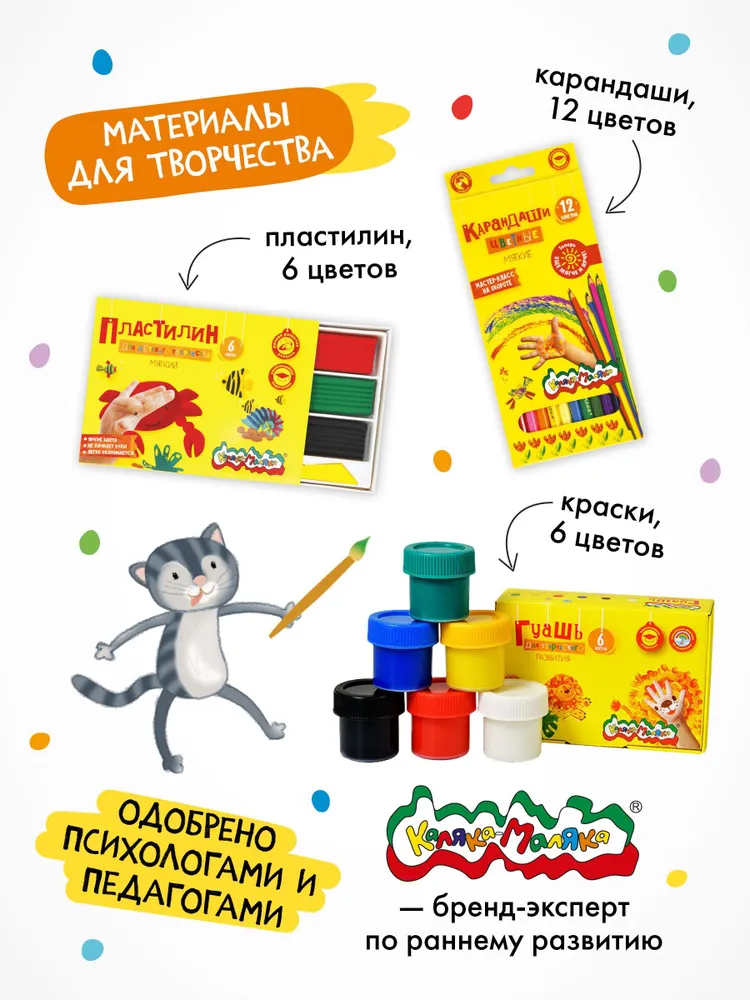 «Развивающий набор для творчества 5+» — это 55 готовых занятий для ребенка от 5 до 6 лет. В Мастерской собраны все основные виды творческой деятельности, доступные малышу: лепка, рисование, аппликация, поделки, а также необходимые материалы: пластилин, карандаши и краски. Кроме того, внутри набора ждет приятный бонус — большой плакат (70Х50 см) для раскрашивания по числам, разработанный в соответствии с возрастными возможностями ребенка, обучающий плакат «Арифметика цвета» и поощрительные наклейки.
