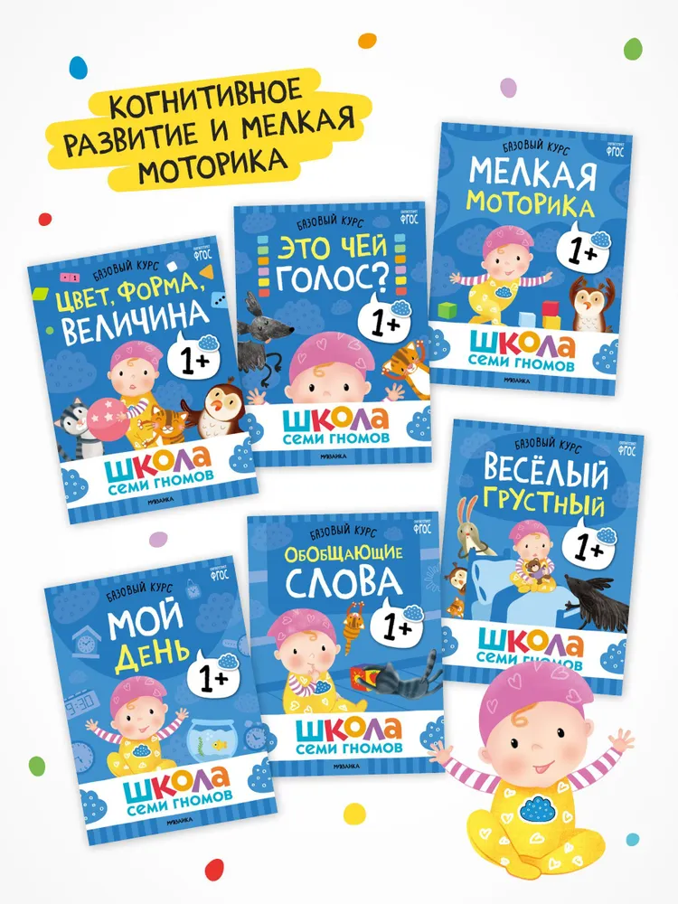 Базовый курс 1+ (Серия «Школа Семи Гномов. Базовый курс»), 6 книг + развивающие игры. Школа Семи Гномов – это система, а не набор книг. Комплекс из 6 книг Базового курса направлен на развитие когнитивных способностей ребенка: познавательный интерес, умение думать, анализировать, делать выводы.Система выстроена таким образом, чтобы ребёнок получил необходимые знания в правильный момент. Поэтому все книжки в Школе Семи Гномов имеют четкую возрастную адресацию и разработаны строго с учетом возрастных возможностей ребенка. Но самое важное, чтобы занятия с ребенком давали результат и приносили радость. Поэтому все задания выстроены от простого к сложному и следуют принципу «развитие через игру». Заниматься с ребенком может любой взрослый, специальных знаний и опыта не требуется. Родительская страничка в каждой книге подскажет, что, как и почему нужно развивать в данном возрасте.А еще в Школе Семи Гномов очень сложно заблудиться, ведь каждому возрасту соответствует свой цвет и свой герой. В течение всего обучения ребенка сопровождают семь Гномов – персонажи, списанные с детей соответствующего возраста. Годовалых малышей сопровождает синий цвет и гномик Тучка.Обучение — это приключение. Пристегните ранцы!