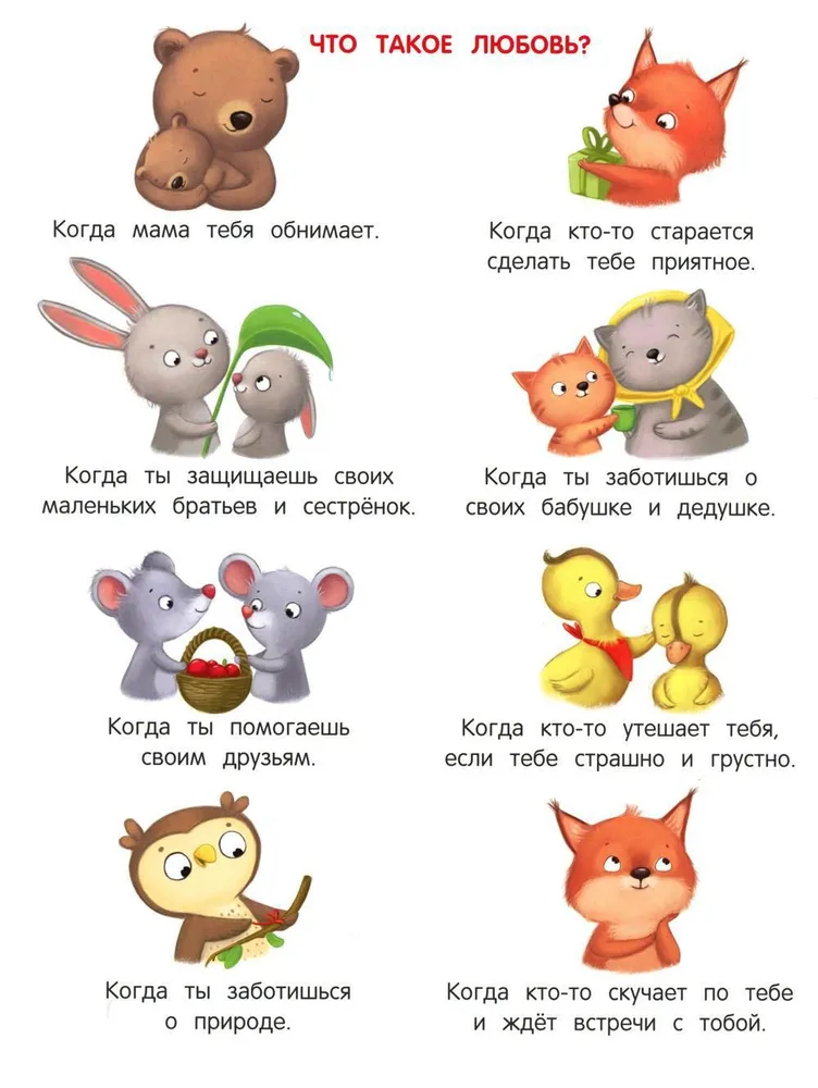 Сказки о зверятах, стихи и задания помогут малышу понять значение слова «любовь». Расскажут, как заботиться о близких, как строить отношения с родными и сверстниками, как стать чутким и заботливым сыном или дочерью, братом или сестрой, другом или подругой, как любить природу, братьев наших меньших и весь наш мир.