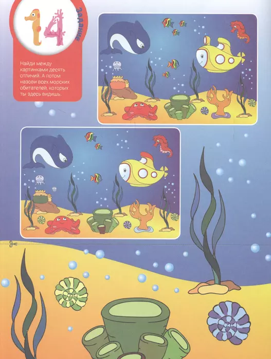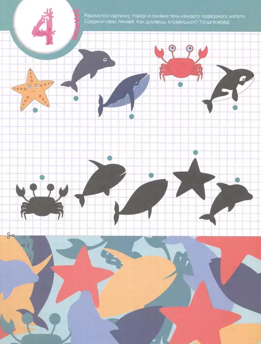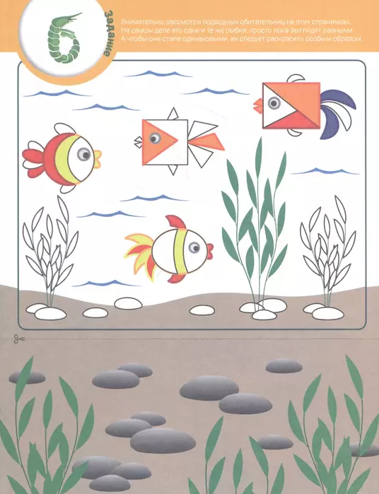 В книге "Под водой" повторяем формы, собираем части целого, ищем отличия, составляем пазлы и, конечно, вырезаем и наклеиваем!