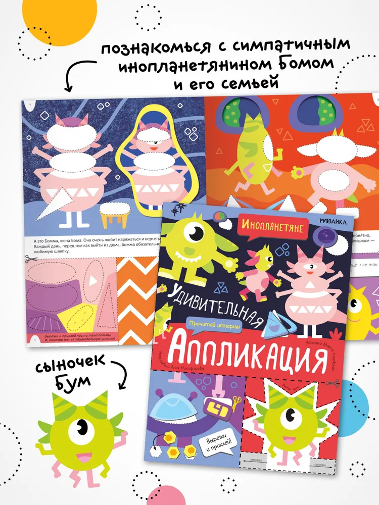 В книге «Инопланетяне» серии «Удивительная аппликация» ребенок познакомится с симпатичным инопланетянином Бамом и его семьей. Особенность и волшебство этой книжки в том, что ребенок сам сможет ее проиллюстрировать. Нужно вырезать цветные элементы внизу каждой странички и приклеить их на подходящие места. Книжка готова! А еще, пока ребенок работает над книжкой, он незаметно для себя потренирует мелкую моторику, глазомер, внимательность и усидчивость.
