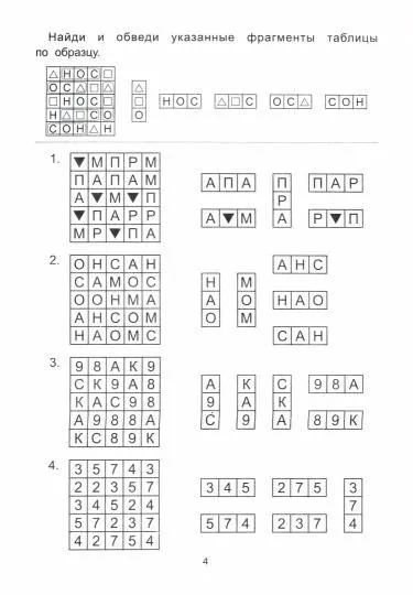 В книге множество заданий на развитие устойчивого зрительного внимания, что, в свою очередь, помогает выработке такого навыка, как усидчивость. С помощью «шифрованных» упражнений ребёнок потренирует мелкую моторику, закрепит знание счёта, букв и геометрических фигур. Большое внимание уделено развитию мышления и речи: «расшифрованные» тексты пополнят словарный запас малыша, познакомят с сокровищами русского языка — пословицами. Задания даются в виде кратких пояснений, а в некоторых случаях — с образцами выполнения в верхней части страницы.