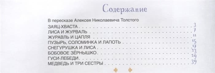 Русские сказки в пересказе известного писателя Алексея Николаевича Толстого (1883-1945) в доступной для детей форме предупреждают об опасностях, подстерегающих доверчивого и несмышлёного, учат дружбе и верности, доброте и смелости.