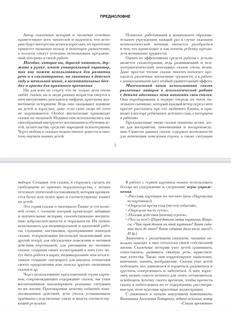 В издании собрано несколько чудесных трогательных сказок про семью ежиков - «колючую семейку». Дети найдут в этих сказках отголоски своей собственной жизни. И непременно подружатся с маленькими Ежиком и Ежишкой. Автор предоставляет читателям возможность по-разному использовать свои произведения для приятного времяпровождения, познавательной деятельности, коррекционной работы и так далее. Яркие и живые иллюстрации отлично дополняют текст, а также могут служить самостоятельным наглядным демонстрационным материалом.
