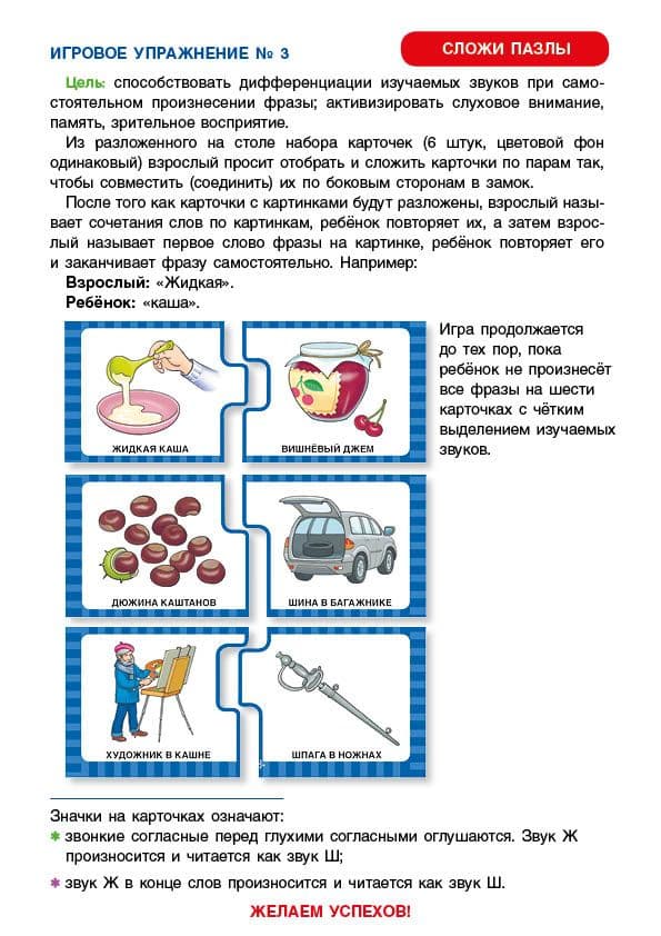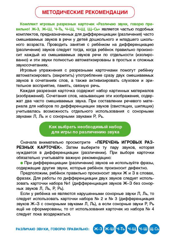 Как научить ребенка различать сложные звуки? Как научить его правильной речи, а в дальнейшем и грамотному письму? В этом поможет комплект игровых разрезных карточек «Школа Натальи Теремковой» — уникальный материал для игровых занятий с ребенком по дифференциации (различения) часто смешиваемых звуков в речи. Вам не нужно думать, какие тетради и пособия подобрать, чтобы правильно организовать обучение малыша. Каждый альбом серии «Различаю звуки, говорю правильно!», который входит в «Школу» — лучшее решение для автоматизации (закрепления) употребления сразу двух смешиваемых звуков в сочетаниях слов. Благодаря комплекту вы также активируете у ребенка слуховое, зрительное восприятие, память и связную речь.  О чём альбом: Трудно представить успешного человека, речь которого невнятна, который не выговаривает половину звуков. Такому человеку придется приложить намного больше усилий, чтобы добиться успеха в жизни. Поэтому так важно научиться говорить правильно с детства. Исправить даже самые сложные свистящие звуки Ж-З, Ж-Ш, Ч-Ть, Ч-Ш, Щ-Сь можно! Если работать над ними в игровой форме. Именно такие занятия Наталья Теремкова предлагает родителям и педагогам в новом альбоме. Каждый комплект — это папка, в которую удобно складывать и хранить 12 двусторонних листов с игровыми разрезными карточками. В каждой папке - гид для взрослого с методическими рекомендациями и правилами игр для автоматизации и дифференциации чистого произношения звуков Ж-З, Ж-Ш, Ч-Ть, Ч-Ш, Щ-Сь в сочетаниях слов. 168 уникальных изображений и словосочетаний, содержащих два наиболее часто смешиваемых звука, научат ребенка выделять заданные звуки из речевого потока, активируют слуховую память, зрительное восприятие и внимание, а также способствуют различению изучаемых звуков при самостоятельном произнесении фразы. Такие игровые задания легко побуждают ребёнка участвовать в процессе исправления звукопроизношения.  Для родителей: Чем раньше обратить внимание на искаженное произношение звуков у ребенка, тем легче исправить эти недостатки речи. Правильно подобранные логопедом-практиком предметные картинки позволяют закрепить произношение сначала в слогах, затем в словах и в сочетаниях слов, предложениях и связной речи. Звуки закрепляются во всех позициях — в начале, в середине и в конце слов. Обратите внимание! При выборе карточек выбирайте то сочетание звуков, которые нуждаются в дифференциации (закреплении). Обращайте внимания на рекомендации вашего логопеда. Не используйте слова и фразы, содержащие другие звуки, которые ребенок произносит дефектно!  О серии: Вот уже 20 лет малыши в детских садах учатся правильно произносить звуки вместе с пособиями автора-логопеда Натальи Теремковой. Комплект серии «Школа Натальи Теремковой» мы разработали специально для закрепления у ребенка уже поставленных звуков вместе с логопедом или дома, с родителями. Учителя-логопеды получают полностью методически проработанный материал для организации системных занятий. Родителям предоставляется возможность закрепить результат занятий с ребёнком в домашних условиях. Игры просты и доступны, разобраться в них сможет любой заинтересованный родитель. В серии представлены 3 альбома на три группы звуков... дальше »: «Различаю звуки, говорю правильно! С-Ш, С-З, С-Ц». «Различаю звуки