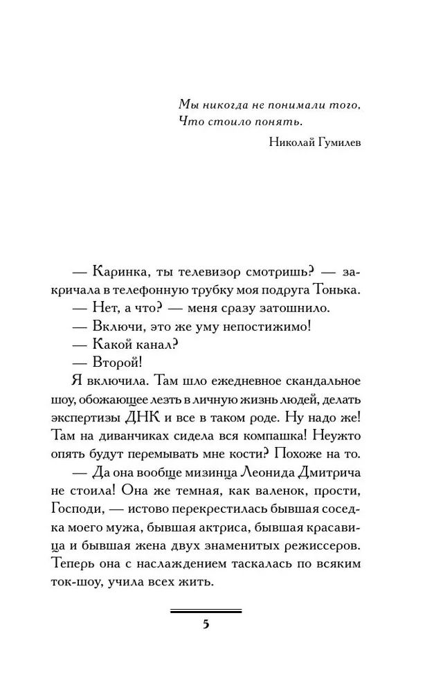 Пять лет назад Карина потеряла горячо любимого мужа, и, кажется, готова к новой жизни. Однако прошлое то и дело напоминает о себе, порой болезненно и неприятно. И все-таки именно очередная встреча с прошлым расставит все по своим местам и Карина, наконец, поймет то, чего не поняла в ранней юности.