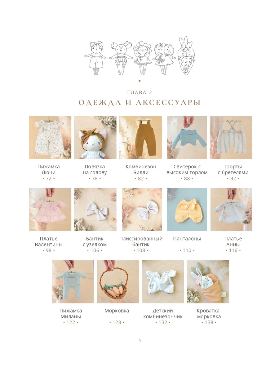 Отдельная часть книги посвящена созданию миниатюрной одежды и аксессуаров. Вы научитесь шить крошечные платьица, удобные пижамки, стильные комбинезоны и очаровательные бантики. Все модели продуманы так, чтобы их было легко снимать и надевать, а главное — они идеально подчеркивают характер каждой игрушки.