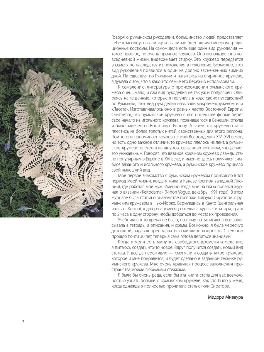 Освойте технику создания румынского кружева вместе с Мидори Миваурой, японской мастерицей, посвятившей более 30 лет изучению этого искусства. Элементы, связанные крючком, сочетаются с деталями, выполненными в игольной технике, и получаются практичные и элегантные изделия для декора интерьера или одежды.