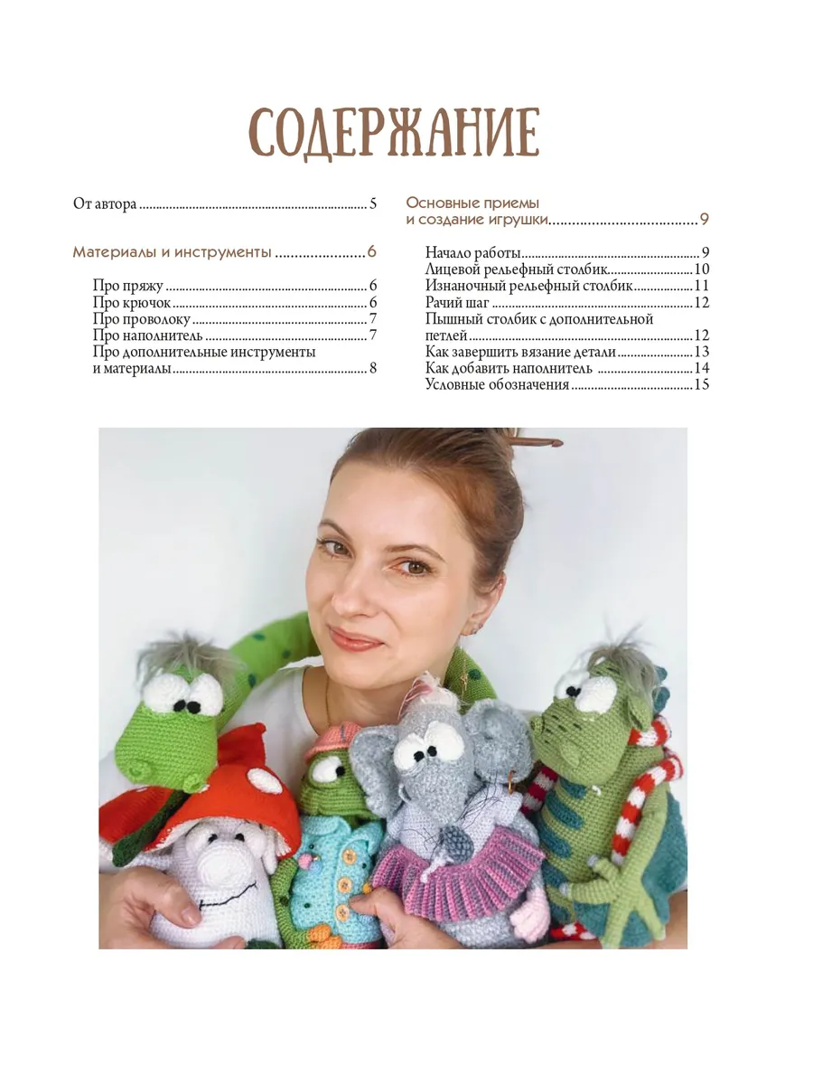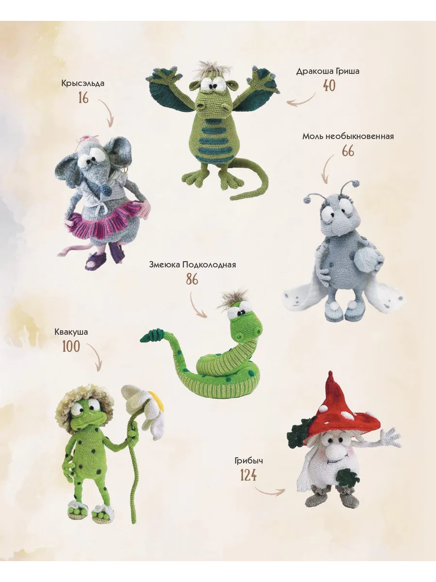 В книге представлено 6 мастер-классов, по которым можно связать крючком забавных и необычных персонажей: дедушку Грибыча, добрую Змеюку, очаровательную Крысэльду, милого Дракошу, лягушек Квакушу и мистера Хлюпа, а также необыкновенную Моль. Все мастер-классы сопровождают пошаговые фото, описания по рядам, советы по выбору инструментов и материалов, набивке, соединению и оформлению деталей. Также в книге собраны основные приемы вязания и видеоуроки от автора.
