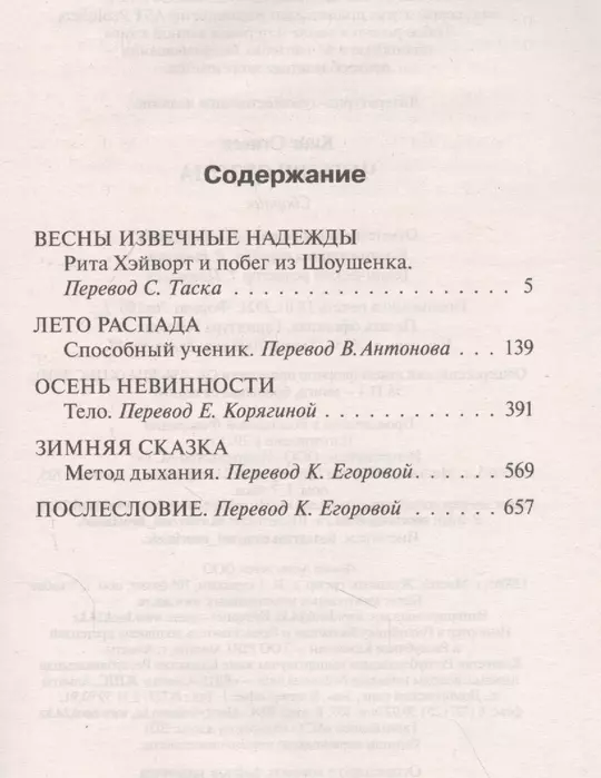 Стивен Кинг — писатель, любящий традиции. И одна из них — это публикация сборников, неизменно состоящих из четырех повестей. «Четыре сезона» стал первым таким сборником. Его заглавная повесть «Рита Хэйворт и побег из Шоушенка» легла в основу легендарного фильма Фрэнка Дарабонта с Тимом Роббинсом и Морганом Фриманом в главных ролях.