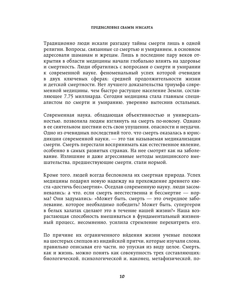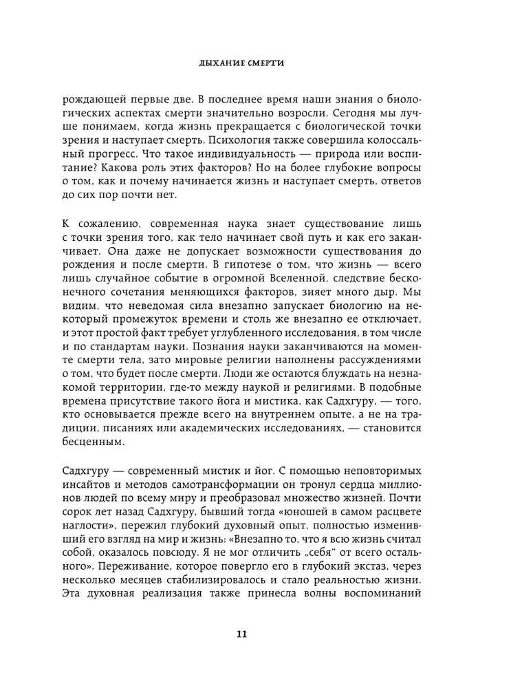 Практический путеводитель по жизни и смерти от самого известного мистика и йога нашего времени. Садхгуру рассказывает, как взаимодействовать с неизбежностью смерти и как, при необходимости, помогать другим. Книга затрагивает все темы, связанные со смертью – от древних ритуалов до современных технологий продления жизни, обширно проиллюстрирована примерами из индийской традиции и личного опыта Садхгуру, С точки зрения йогической науки смерть – это не финал. Обстоятельства смерти человека важны, поскольку во многом определяют, будет его дальнейший путь подобен аду или раю. "Если мы не можем научить всех людей в мире хорошо жить, то, по крайней мере, попробуем научить их хорошо умирать" – из этого намерения Садхгуру родилась данная книга. В первой части "Жизнь и смерть в одном дыхании" автор описывает основной механизм жизни и смерти, знакомя читателя с йогическим воззрением. Во второй части "Величие смерти" он разъясняет, что такое "хорошая" смерть, как к ней подготовится и победить страх. Здесь вы найдете ценную информацию о том, что можно сделать для умирающего, как поддержать ушедшего в посмертном путешествии, как справиться с горем после утраты близкого человека. В третьей части "Жизнь после смерти" Садхгуру рассказывает о бестелесных существах и их воздействии на живых людей. Здесь также затрагиваются ключевые вопросы, связанные с процессом реинкарнации. Садхгуру дает практические советы о том, как подготовиться к рождению ребенка, а также объясняет, почему попытки вспомнить свои прошлые жизни, как правило, бессмысленны и опасны.