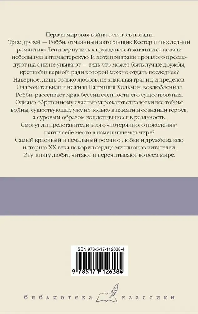 Первая мировая война осталась позади. Трое друзей - Робби, отчаянный автогонщик Кестер и "последний романтик" Лени вернулись к гражданской жизни и основали небольшую автомастерскую. И хотя призраки прошлого преследуют их, они не унывают - ведь что может быть лучше дружбы, крепкой и верной, ради которой можно отдать последнее? Наверное, лишь только любовь, не знающая границ и пределов. Очаровательная и нежная Патриция Хольман, возлюбленная Робби, рассеивает мрак бессмысленности его существования. Однако обретенному счастью угрожают отголоски все той же войны - существующие уже не только в памяти и сознании героев, а суровым образом воплотившиеся в реальность. Смогут ли представители этого "потерянного поколения" найти себе место в изменившемся мире?