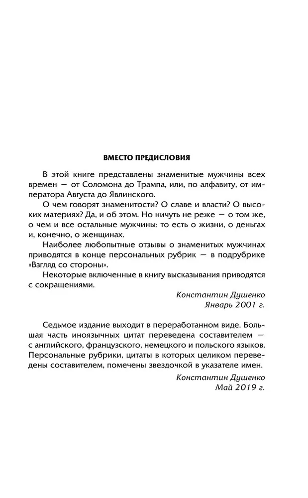 В книге собраны мысли и афоризмы знаменитых мужчин всех времен — от Соломона до Трампа, или, по алфавиту, от императора Августа до Явлинского.