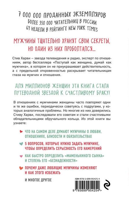 Миллионы женщин по всему миру доверилисьв этом вопросе Стиву Харви, знаменитому радиоведущему суперпопулярного в США "Утреннего шоу Стива Харви". В своей книге, ставшей бестселлером не только в Америке, но и в России, он помогает читательницам понять ход мыслей представителей сильного пола и отвечает на множество наболевших вопросов. Например, таких: "Что вы должны, а что не можете требовать от своего мужчины?", "Как распознать маменькиного сыночка, и что делать в этом случае?", "Когда знакомить кавалера со своими детьми?", "Какие пять вопросов нужно задать мужчине, чтобы определить серьезность его намерений?"