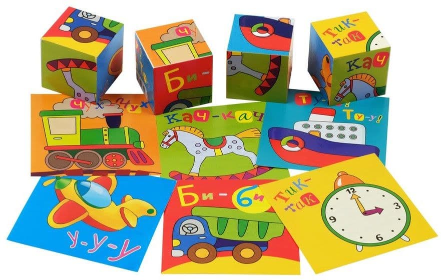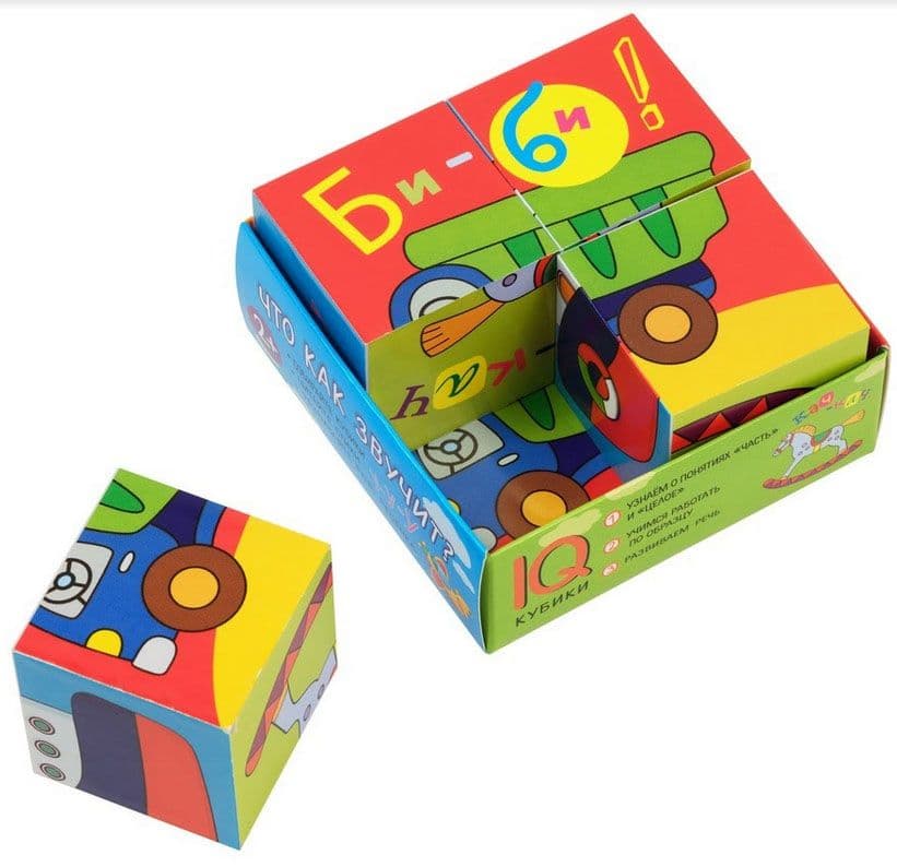 Набор состоит из 4 кубиков размером 4х4 см. Ребёнку нужно сложить картинку из 4 фрагментов. В качестве подсказки даны 6 картинок с изображением предметов. Картинка кладётся на дно коробочки, и ребёнок ставит на неё нужные кубики. На обратной стороне картинок даны стихи на звукоподражание. Повторение звуков предметов способствует развитию речи ребёнка. Во время игры происходит знакомство с понятиями "часть и целое", развивается умение работать по образцу. Наклейки на кубики сделаны из качественной гладкой бумаги, которая не портится от игры.