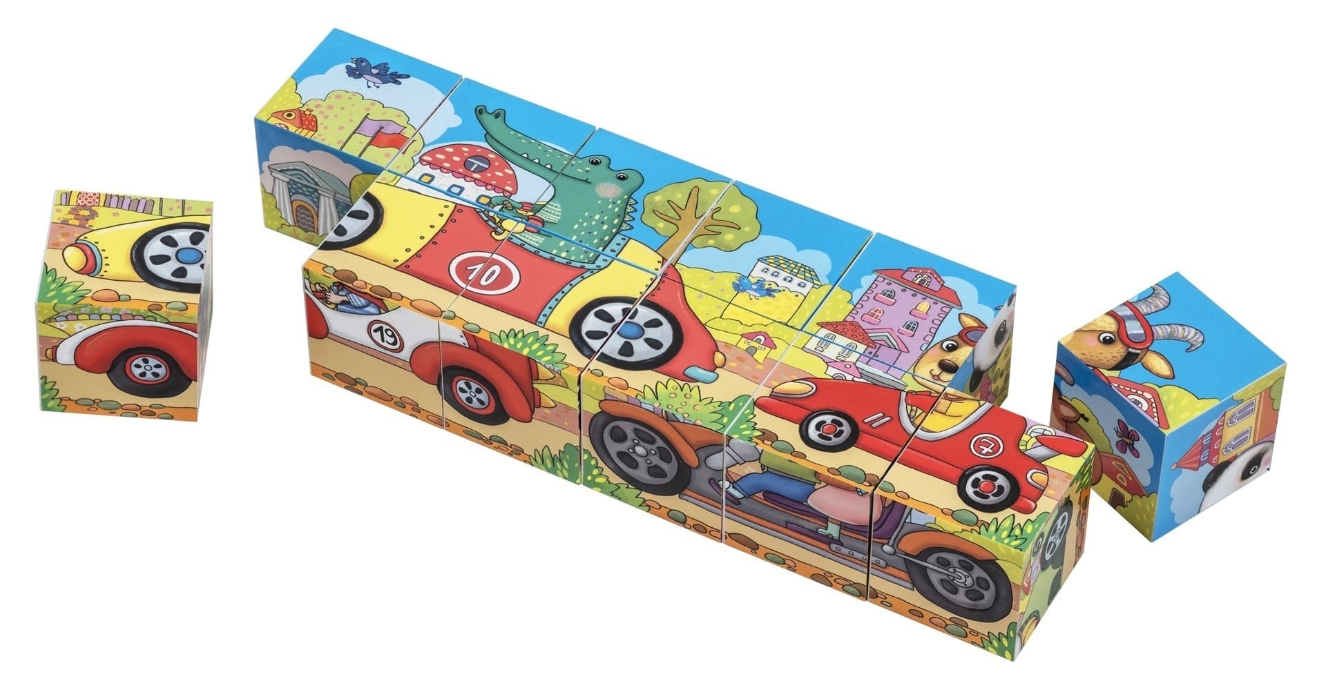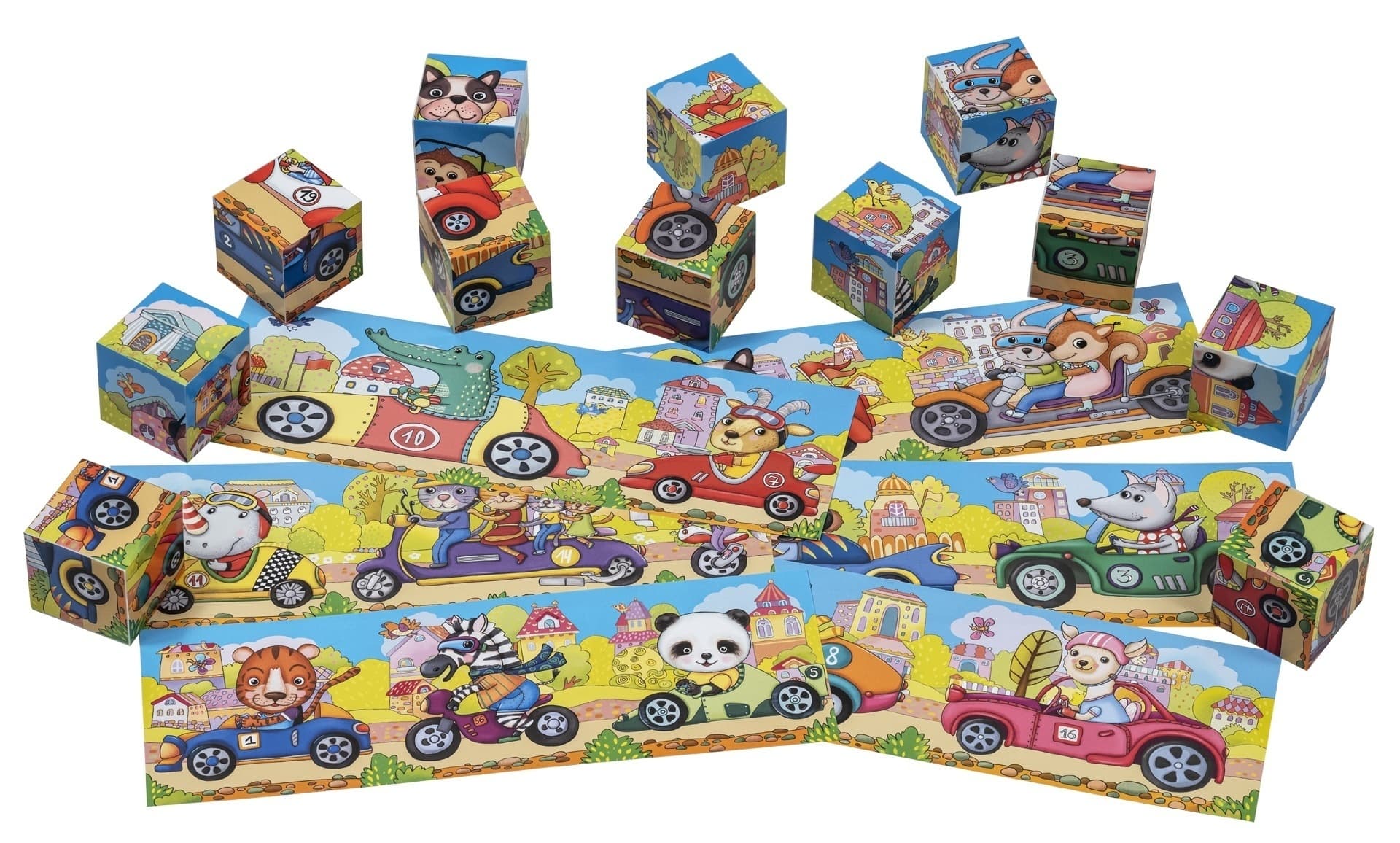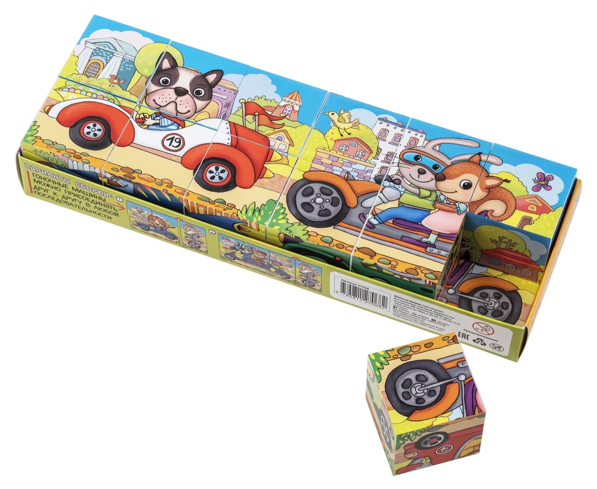 Набор состоит из 12 кубиков размером 4х4 см. Ребёнку нужно сложить картинки из 2, 4, 6 и 8 фрагментов. В этом ему помогут листовки-подсказки с изображением гоночных машин. Далее машины можно соединить в любой последовательности, картинки взаимозаменяемы. Во время игры происходит знакомство с понятиями "часть и целое", развивается умение работать по образцу. Наклейки на кубики сделаны из качественной гладкой бумаги, которая не портится от игры.