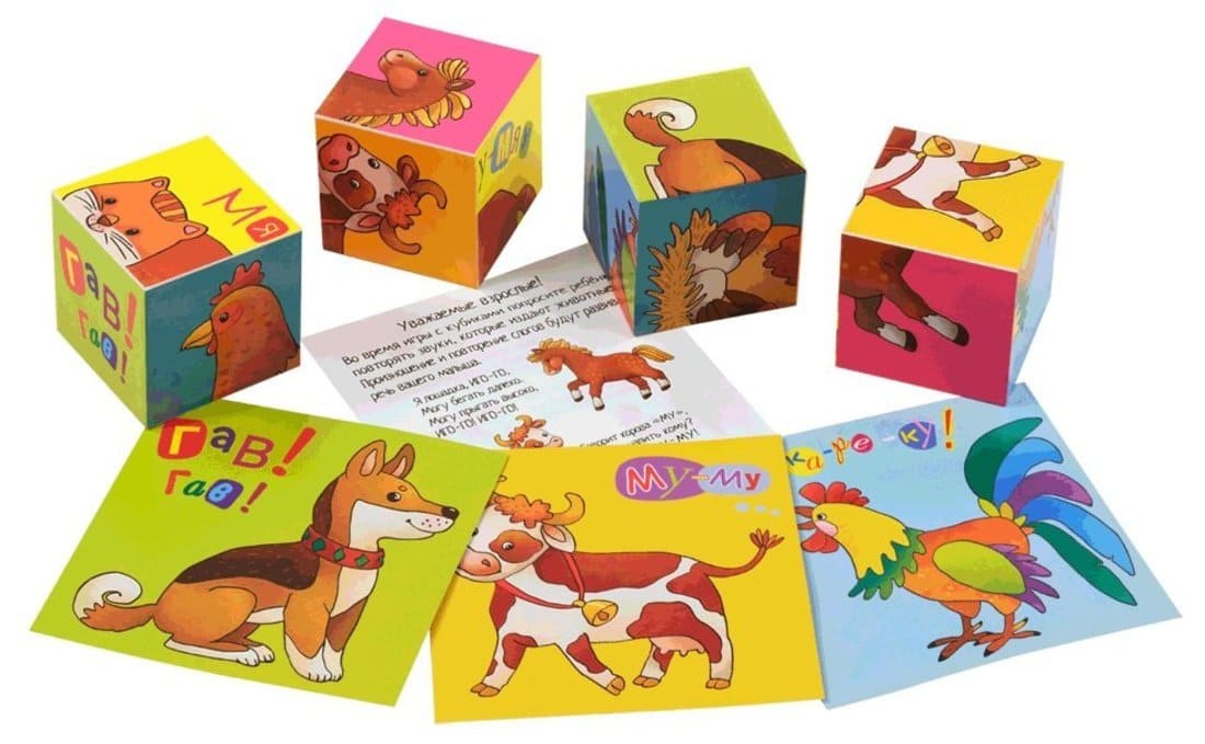 Набор состоит из 4-х кубиков размером 4х4 см. Ребёнку нужно сложить картинку из 4-х фрагментов. В качестве подсказки даны 6 картинок с изображением животных. Картинка кладётся на дно коробочки, и ребёнок ставит на неё нужные кубики. На обратной стороне картинок даны стихи на звукоподражание. Повторение звуков, которые издают животные, способствует развитию речи ребёнка. Во время игры происходит знакомство с понятиями «часть» и «целое», развивается умение работать по образцу. Наклейки на кубики сделаны из качественной гладкой бумаги, которая не портится от игры. А ещё малыша ждёт сюрприз! Если сложить картинку и перевернуть все кубики, появится другая картинка.