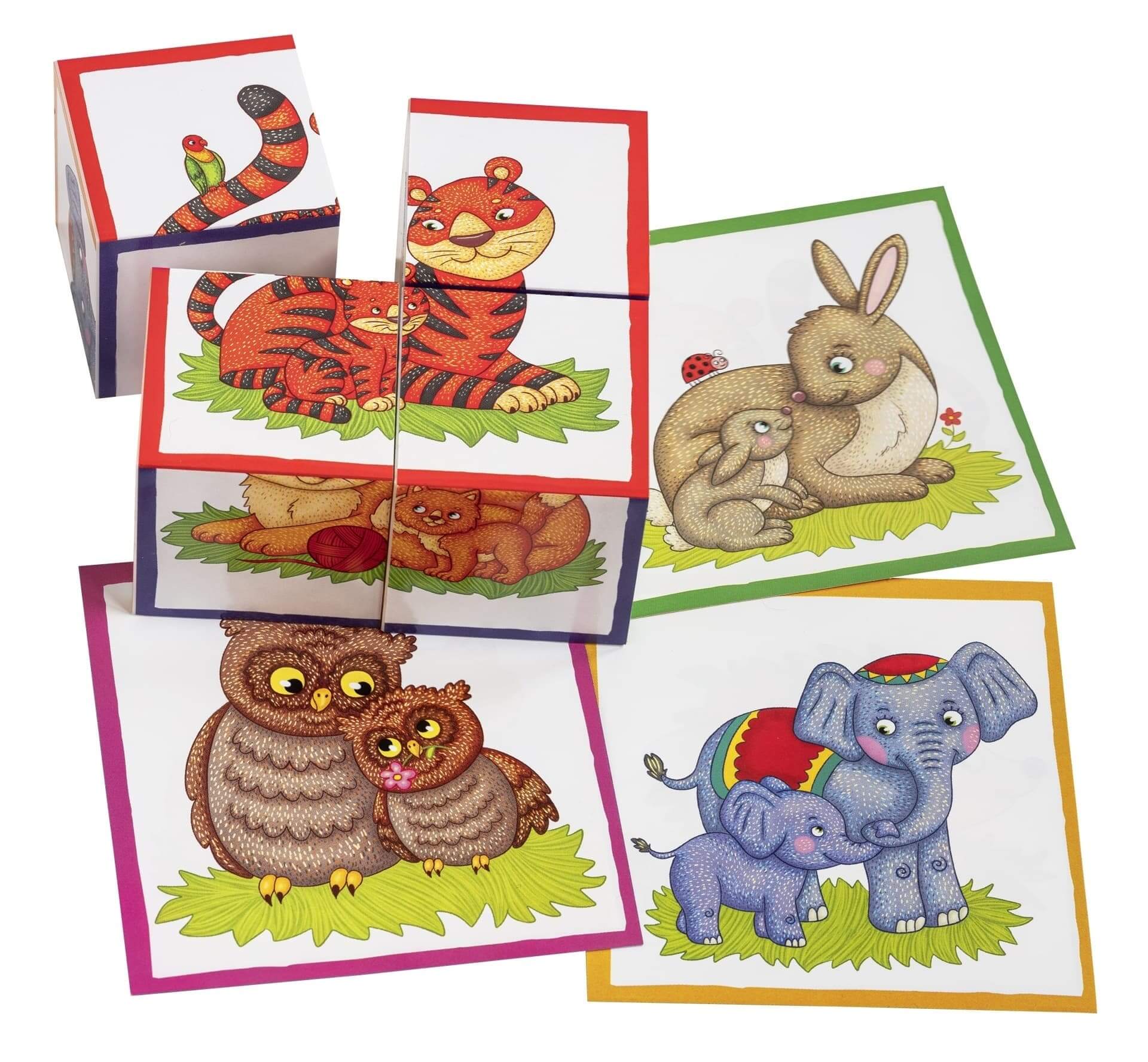 Набор состоит из 4 кубиков размером 4х4 см. Ребёнку нужно сложить картинку из 4 фрагментов. В качестве подсказки даны 6 картинок с изображением животных — мамы и малыша. Картинка кладётся на дно коробочки, и ребёнок ставит на неё нужные кубики. Во время игры происходит знакомство с понятиями «часть» и «целое», развивается умение работать по образцу. Наклейки на кубики сделаны из качественной гладкой бумаги, которая не портится от игры. А ещё малыша ждёт сюрприз! Если сложить картинку и перевернуть все кубики, появится другая картинка. Набор предназначен для детей от 2 лет.