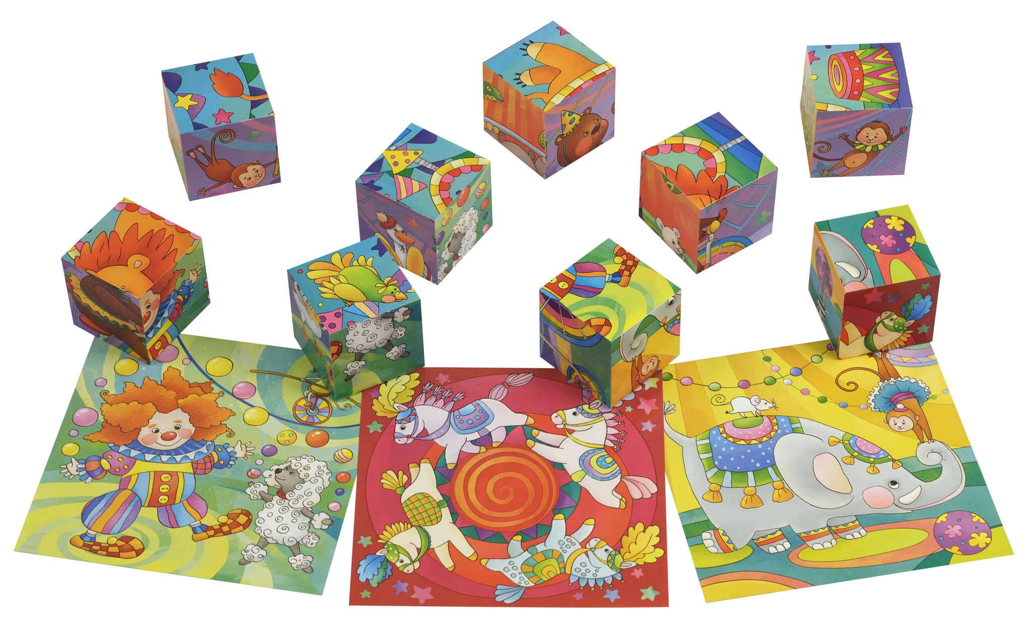 Комплект из 9 кубиков разработан специально для развития детей от 4 лет. Ребёнку нужно сложить картинку из 9 фрагментов. В качестве подсказки даны 6 картинок с изображениями из жизни цирка.