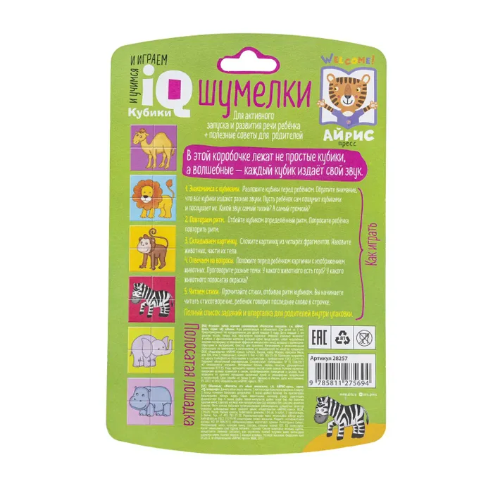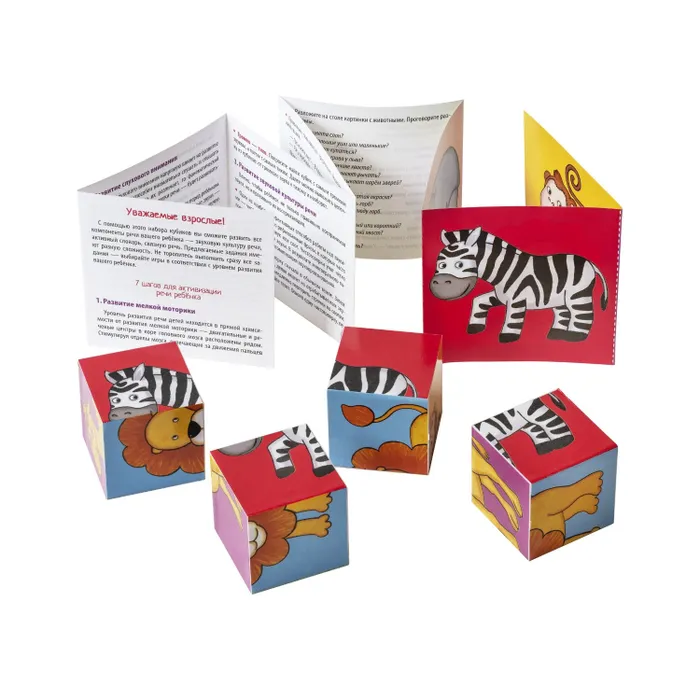 Набор состоит из 4 кубиков, из которых можно сложить 6 картинок с изображением животных Африки. Благодаря различным наполнителям каждый кубик издаёт свой звук. Ребёнок учится различать звуки, их громкость, отбивать ритм, слушает ритмические стихи. В процессе игры развиваются фонематический слух, активная речь, мышление, умение работать по образцу, происходит знакомство с понятиями "часть и целое". Наклейки на кубики сделаны из качественной гладкой бумаги, которая не портится от игры.