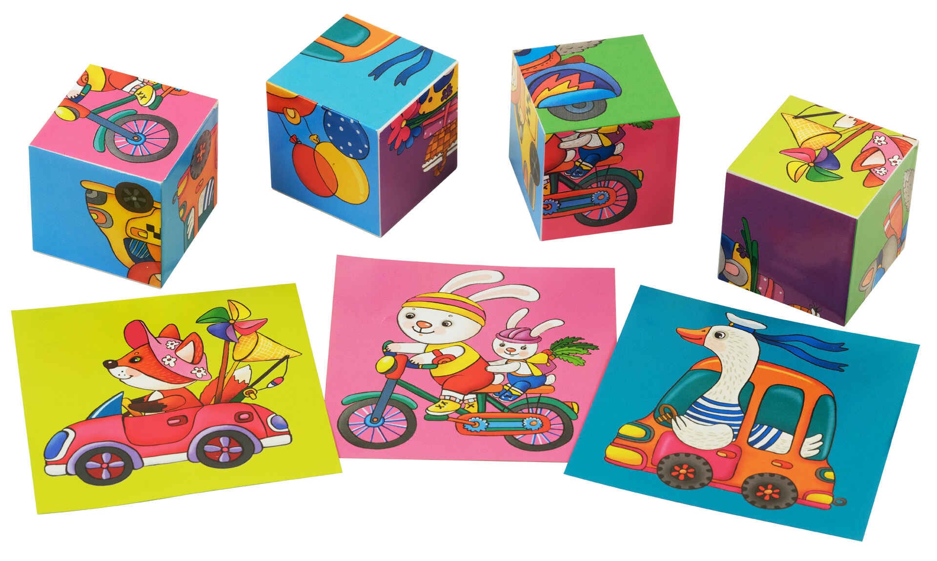 -Умные кубики в поддончике. 4 штуки. Кто на чем едет?