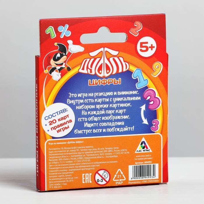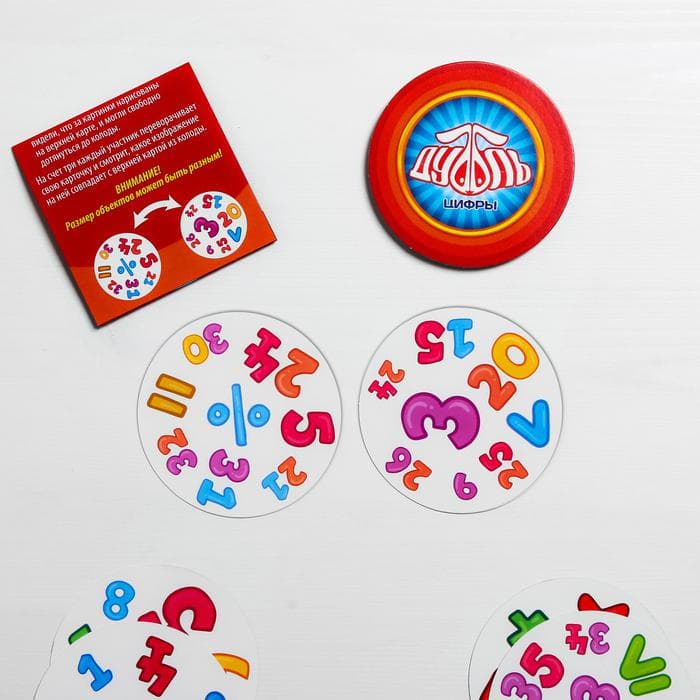 Изучаем цифры — играем в «Дуббль»! Это простая и захватывающая игра на внимание, которая познакомит маленьких участников с цифрами и знаками. Вас ждут карты с уникальным набором ярких картинок. На каждой паре карт есть общее изображение. Ищите совпадения быстрее всех и побеждайте! Что нужно делать? На счёт три все участники переворачивают свои карточки и смотрят, какое изображение на карточках совпадает с верхней картой из колоды. Первый, кто отыщет такую картинку, кричит: «Дуббль!», забирает верхнюю карту из колоды и кладет её сверху на свою карту. Тем самым он открывает следующую карточку в колоде, и теперь совпадения нужно искать уже с другими картинками. А как только все карты в колоде закончатся, переходите к подведению итогов. Участник, который набрал больше всех карт, объявляется победителем! Внутри вы найдёте: 20 карт, правила игры. Играйте, хватайте, побеждайте! Дополнительно Размер карт: 83 ? 83 мм