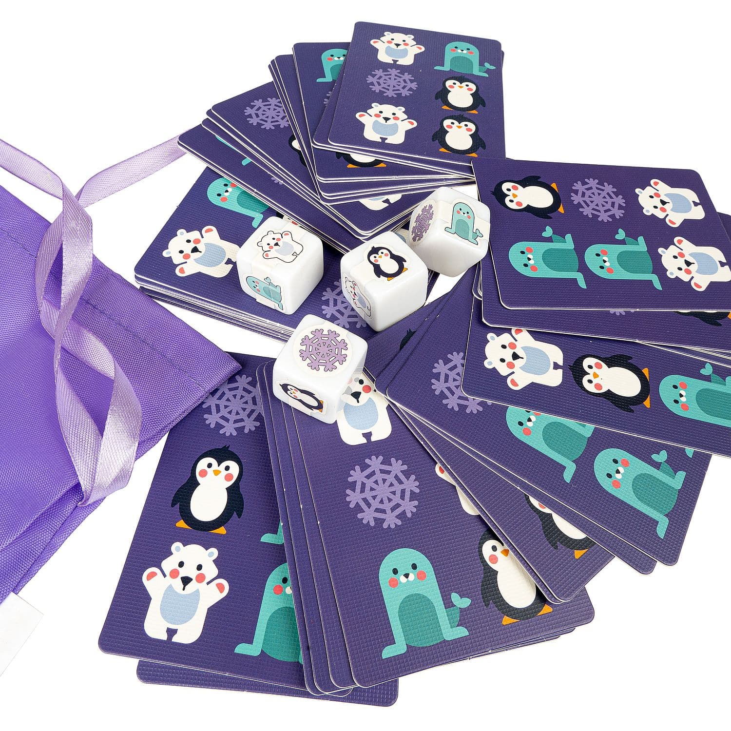 Кубики все одинаковые: две грани пустые, на четырех остальных нарисованы БЕЛЫЙ МИШКА, СНЕЖИНКА, ПИНГВИН и ТЮЛЕНЬ. Самый старший игрок бросает 4 кубика одновременно и все вместе смотрят выпавшую комбинацию.