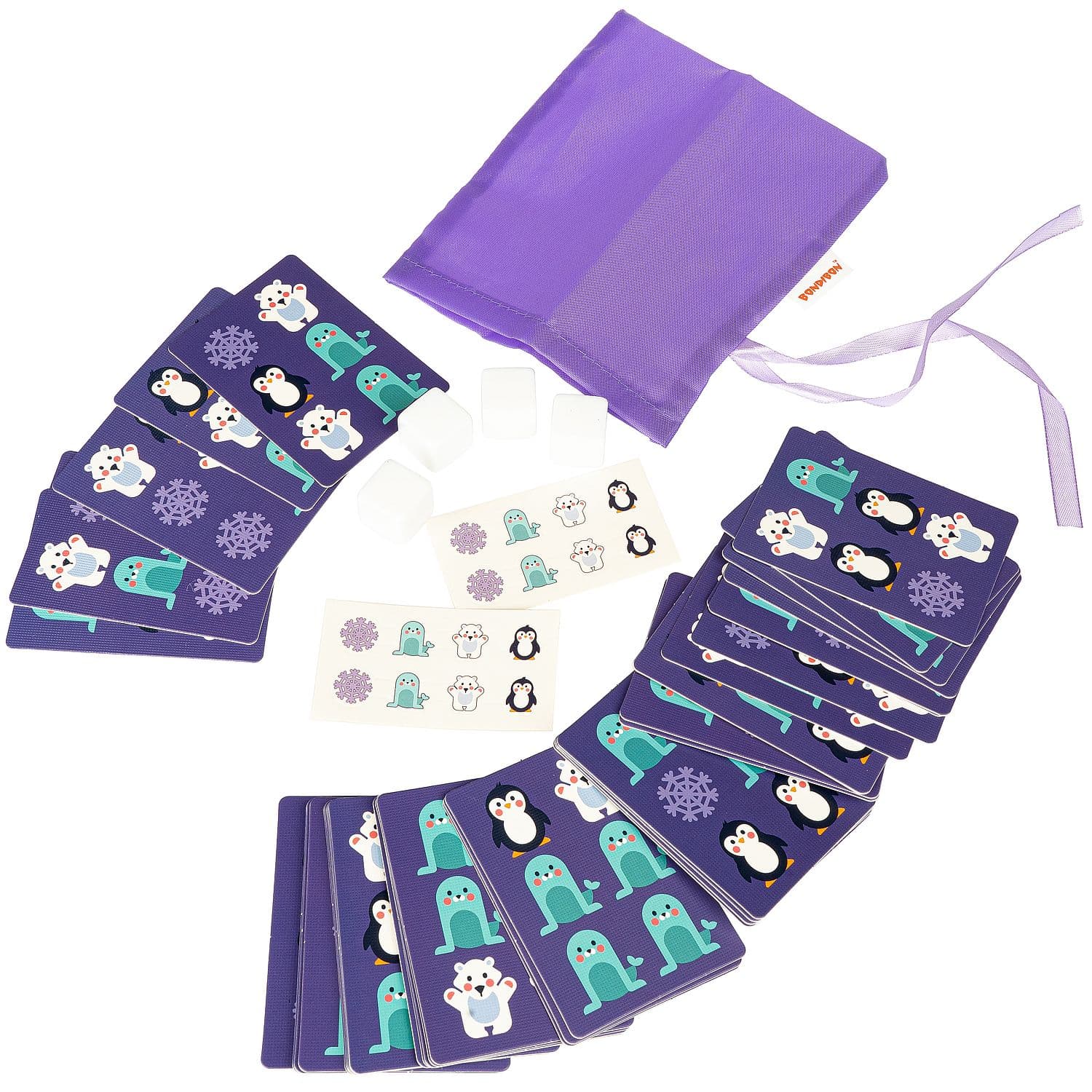 Состав набора: 40 игровых карт, 4 кубика, лист с наклейками, тканевый мешочек, с которым игру удобно взять с собой в гости или в путешествие.