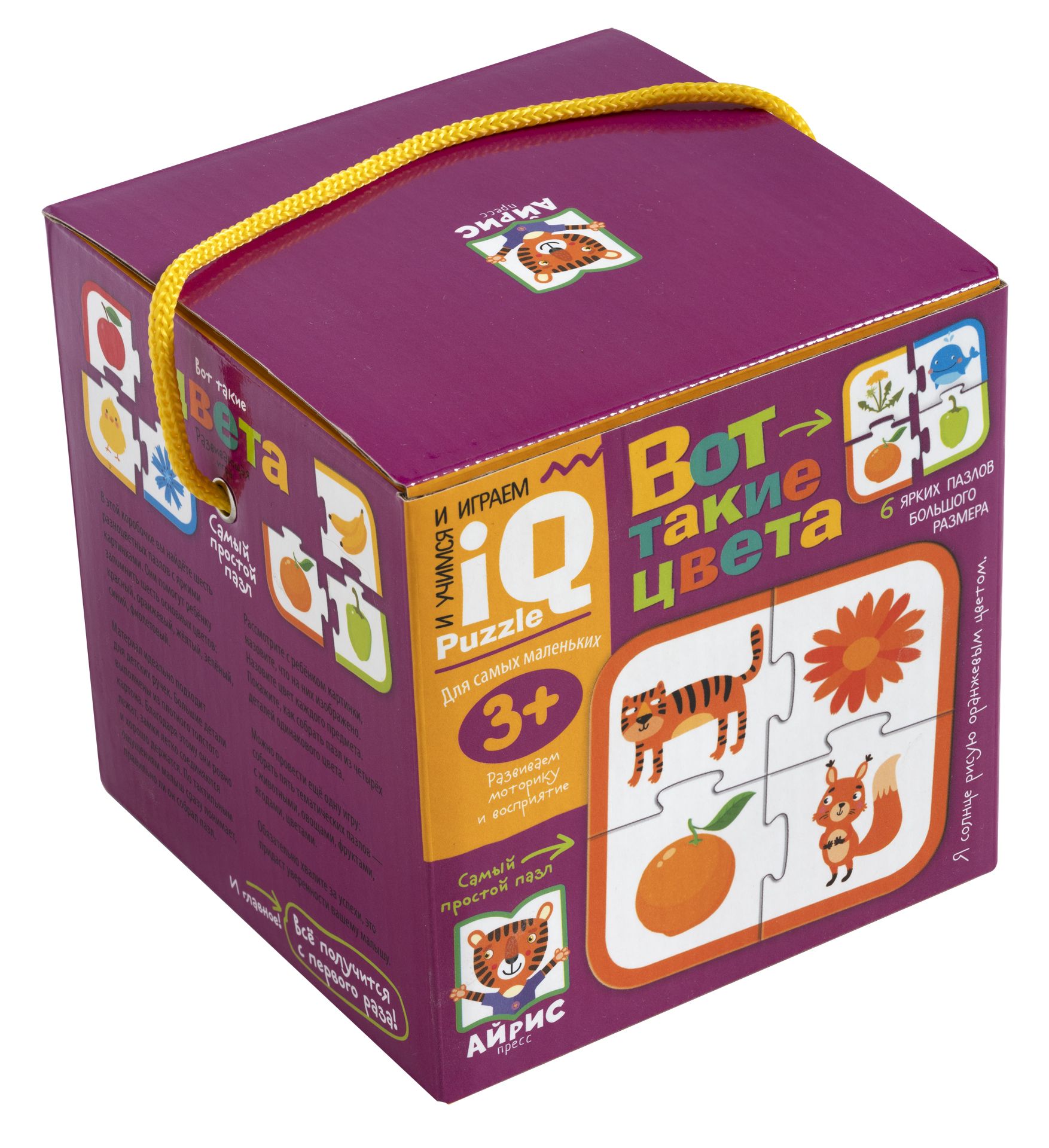 Пазлы «Вот такие цвета» – это увлекательная настольная игра, которая поможет ребёнку запомнить шесть основных цветов: красный, жёлтый, зелёный, синий, оранжевый и фиолетовый. Задача - сложить шесть пазлов разного цвета. Каждый пазл состоит из четырёх картинок, на которых изображены животные и растения. Более сложный вариант игры: собрать с ребёнком тематические пазлы – с животными, овощами, фруктами, ягодами и цветами.