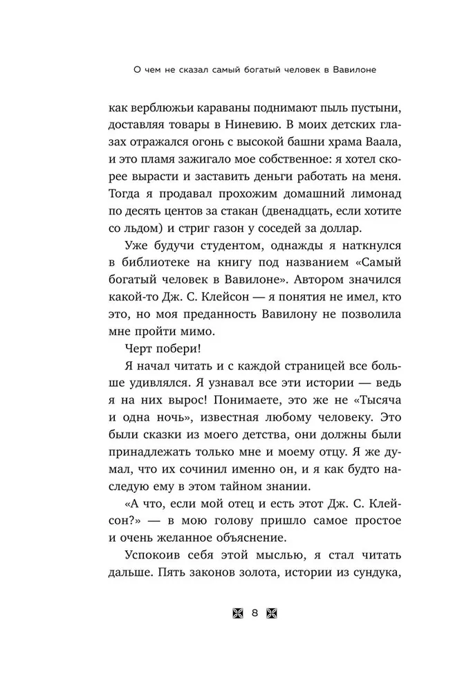 Вы узнаете притчи, рассказанные Джорджем Клейсоном своему ученику, но по неведомой причине не вошедшие в основную книгу. В них богатейшие люди древнего города делятся мудростью, которая лежит в основе любого нажитого состояния. Герои потерянных притч Клейсона объясняют, как: