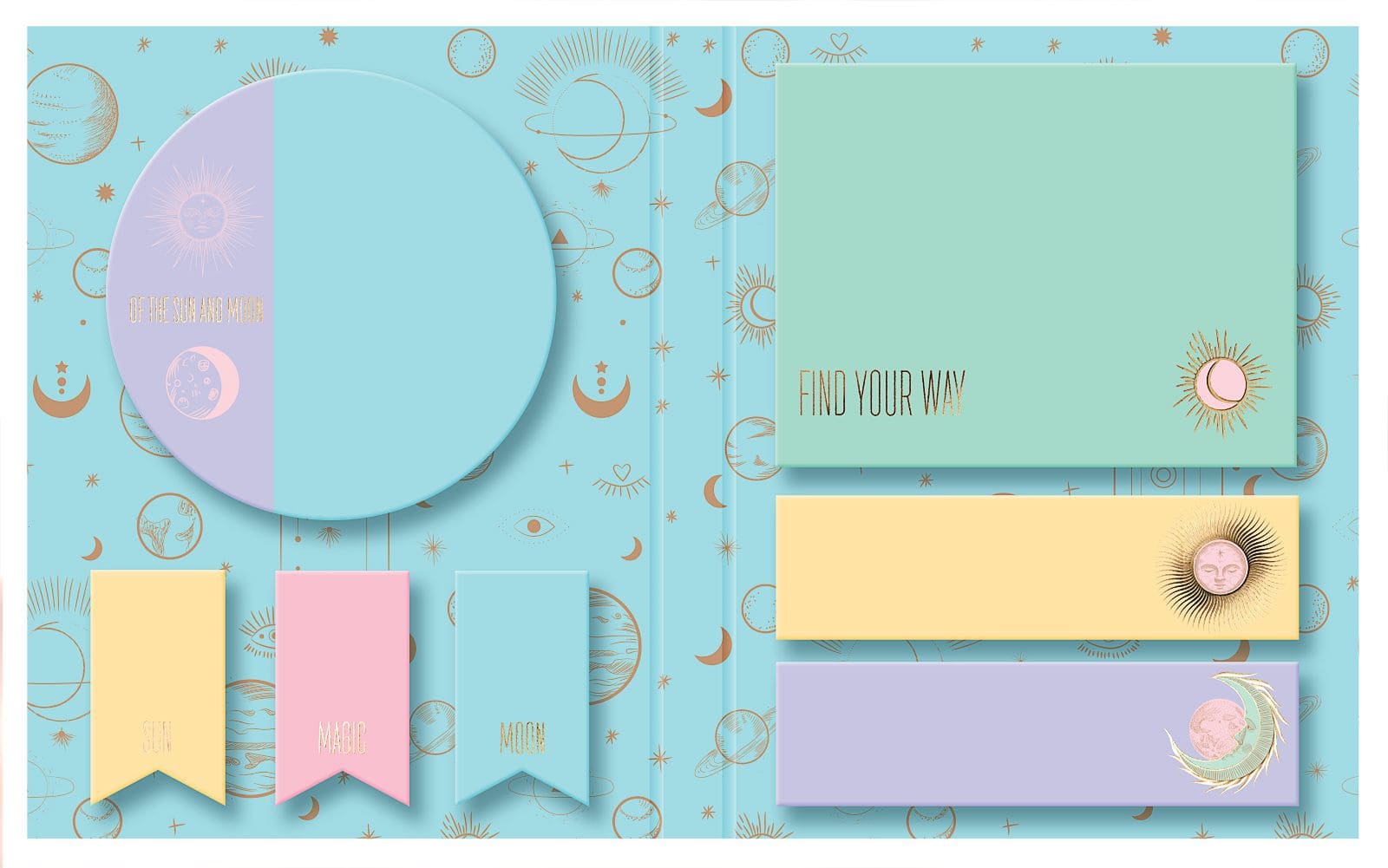 Количество листов в каждом блоке – 40 штук. Набор состоит из двух клейких блоков (круглой и прямоугольной формы), двух блоков прямоугольных закладок и трех блоков закладок в форме флажка. Блоки клейкие для записей и закладки — пастельных оттенков 6-ти цветов. Клейкие блоки украшены не только приятным и завораживающим принтом, но и золотой фольгой.