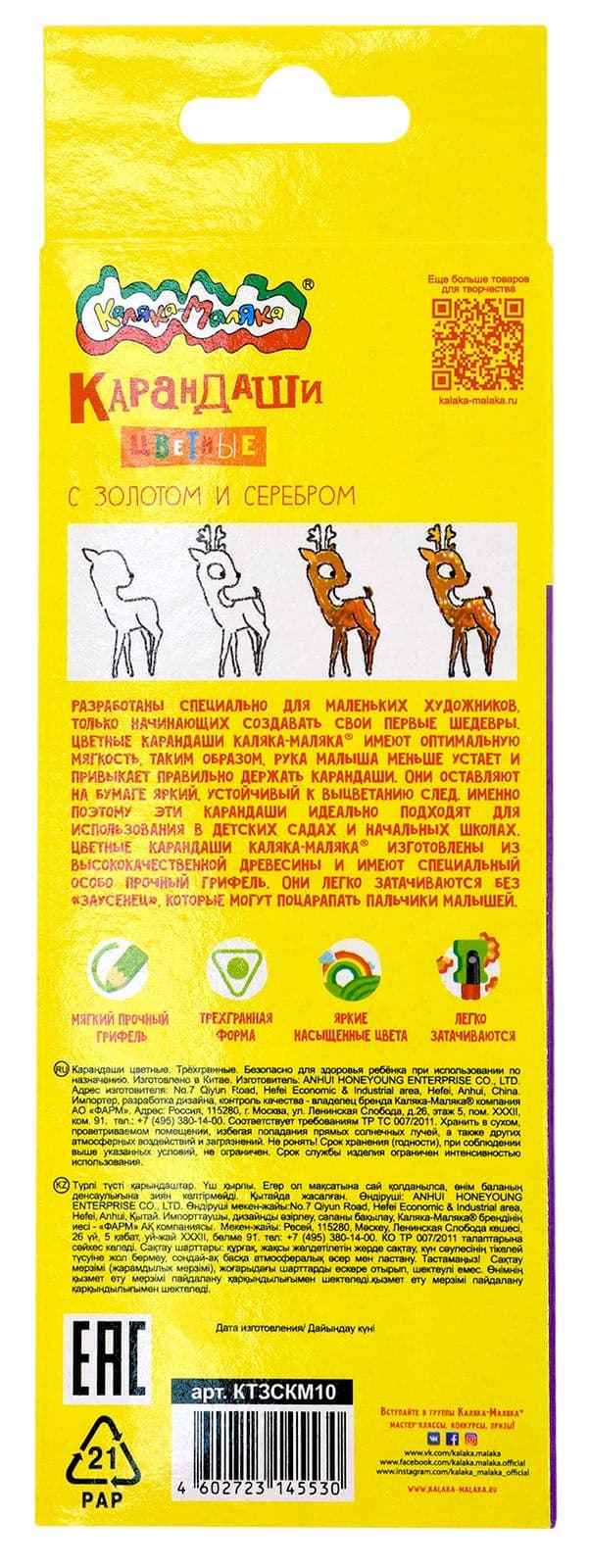 Набор цветных карандашей Каляка-Маляка с золотом и серебром подарит сказку маленькому художнику. Яркие, мягкие карандаши легко затачиваются. Ими приятно и удобно рисовать. Трехгранный корпус приучает маленького художника правильно держать ручку с самого раннего возраста. Цветные карандаши также способствуют развитию мелкой моторики и цветовосприятия.