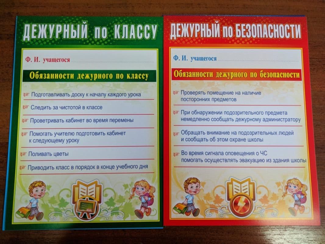Комплект из 4 плакатов: "Дежурный по школе", "Дежурный по классу", "Дежурный по безопасности", "Дежурный по столовой".