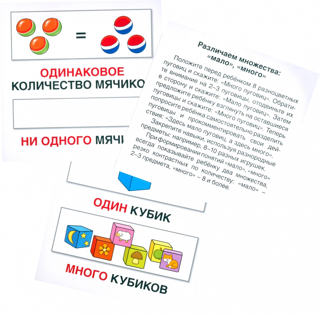 Комплект включает три вводные карточки: "один - много", "мало - много", "одинаковое количество - ни одного" и девять пар карточек, лицевые стороны которых ребёнок должен приложить друг к другу, составив пару "один - много".