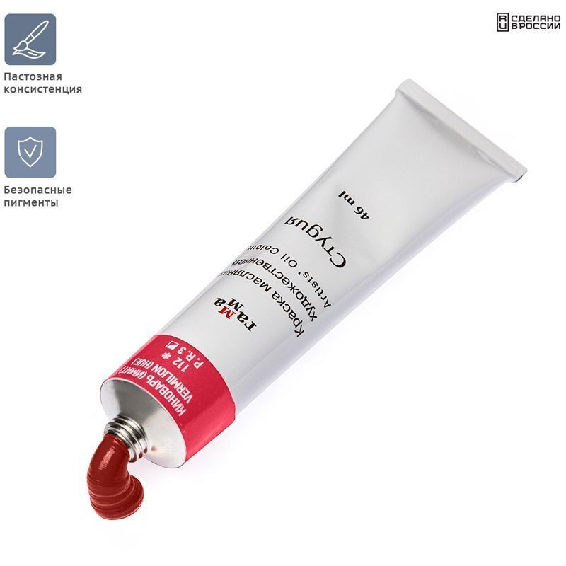 Штучная масляная краска серии «Студия» цвета киноварь не уступает тонкотёртым масляным краскам по степени перетира, пастозности и светостойкости. Состав красок экологически безопасен благодаря имитациям кадмиево-кобальтовой группы пигментов. Продукт идеально подходит для начинающих художников и студентов художественных училищ. Объём тубы — 46 мл.