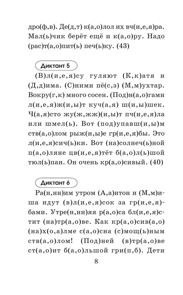 Специально подобранные тексты помогут ученикам в совершенстве освоить орфограммы, которые, как правило, вызывают у них серьезные трудности. В диктантах, содержащихся в пособии, ребенок сам должен выбирать нужную букву из предложенных ему вариантов написания. Самостоятельно проработав и усвоив предложенный материал, ребенок уже без труда справится с самыми сложными диктантами по русскому языку. В комплекте с этой книгой выпущена другая - для совместной работы детей и взрослых.